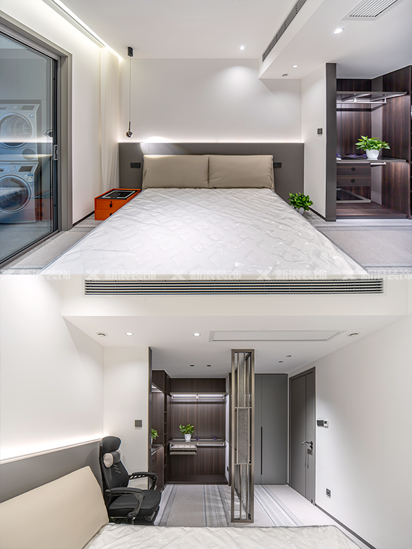 主臥做高級套間設(shè)計,木質(zhì)開放衣帽柜結(jié)合鋼架結(jié)構(gòu)開放式,更有一種打破傳統(tǒng)格式的效果