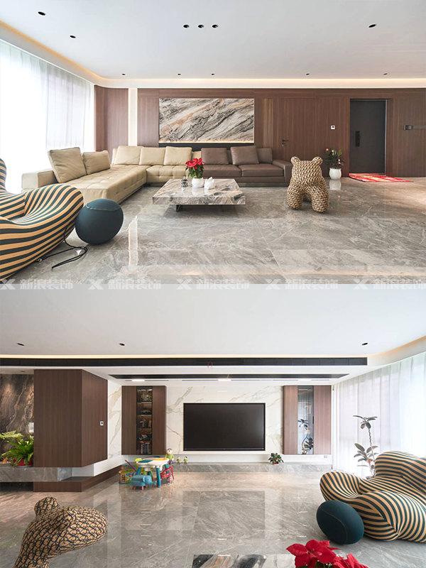 沙發(fā)背景和電視背景均采用巖板設計,進行點綴以及呼應整個空間