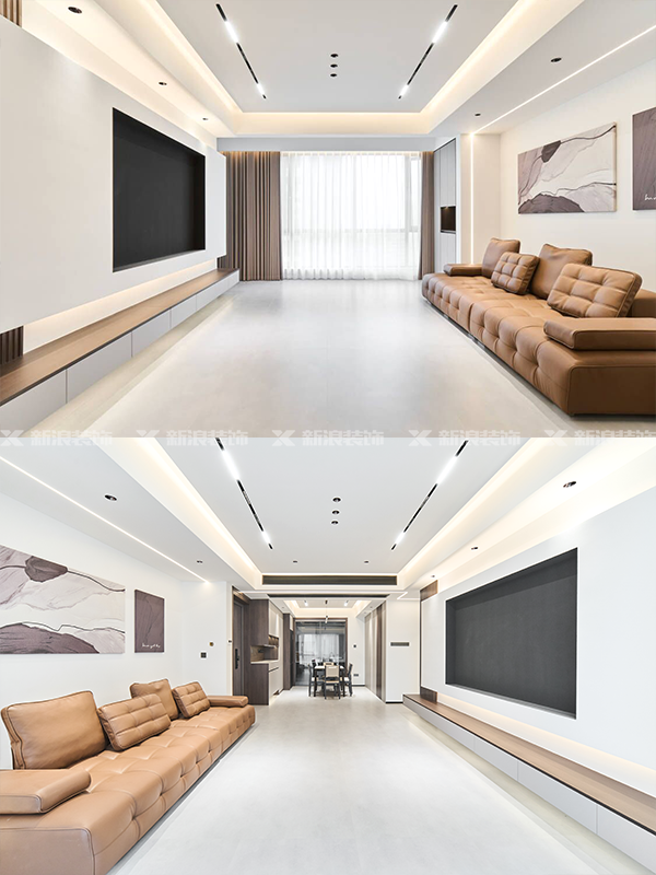 客廳收納柜做免拉手設(shè)計(jì),搭配隱藏式燈帶,視覺上更顯大氣