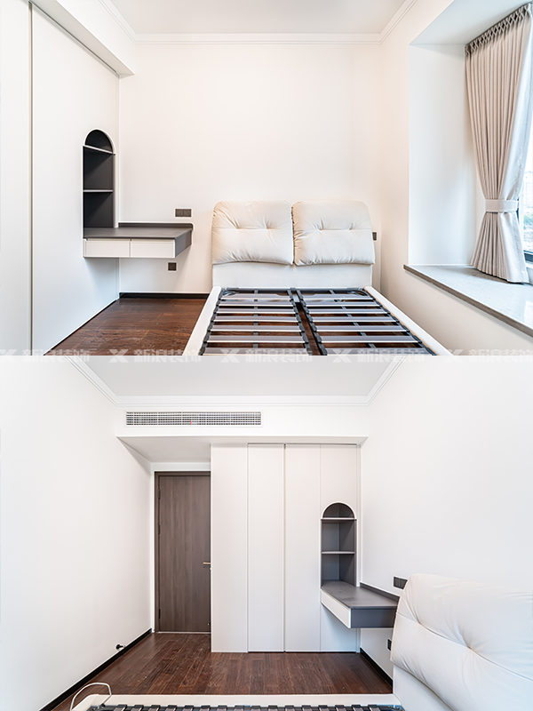 主臥擯棄轉(zhuǎn)交衣帽間,采取床尾柜更加大氣,背景墻也有增加氛圍感、整體感的作用。衣帽間的鍍膜玻璃,也可以讓我們避免鏡子小的尷尬處境!