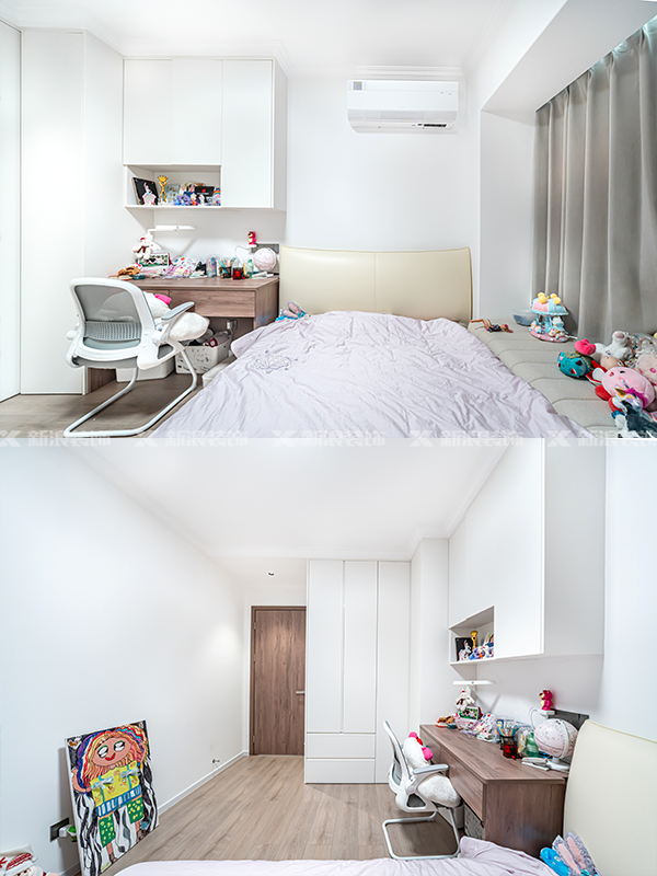 全屋定制柜用金絲橡木+珍珠白搭配,同樣做無拉手分段設(shè)計(jì),抽屜外置,方便拿取。